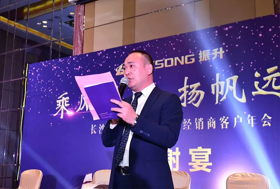 在雷鸣般掌声中,集团董事长卢总首先上台发表致辞,热烈欢迎经销商们的到来。卢总表示,刚刚过去的2019年,是振升稳固基础、抢攻新市场的关键一年;是市场拓展、队伍建设取得骄人成绩的一年;是迎接挑战、克服困难、努力完成任务的一年。