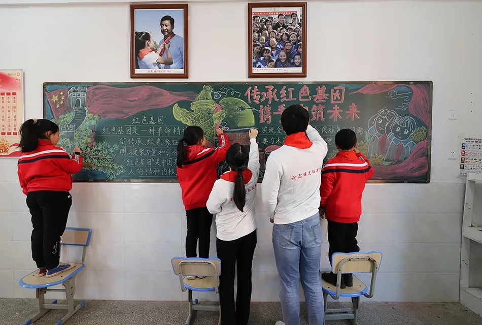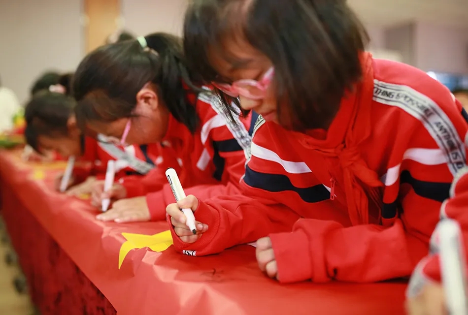 孩子们在“托起明天的太阳”条幅上纷纷签下自己的名字,并与振升集团党员代表们一起绘制充满梦想色彩的主题黑板报,共同描绘美好的明天。