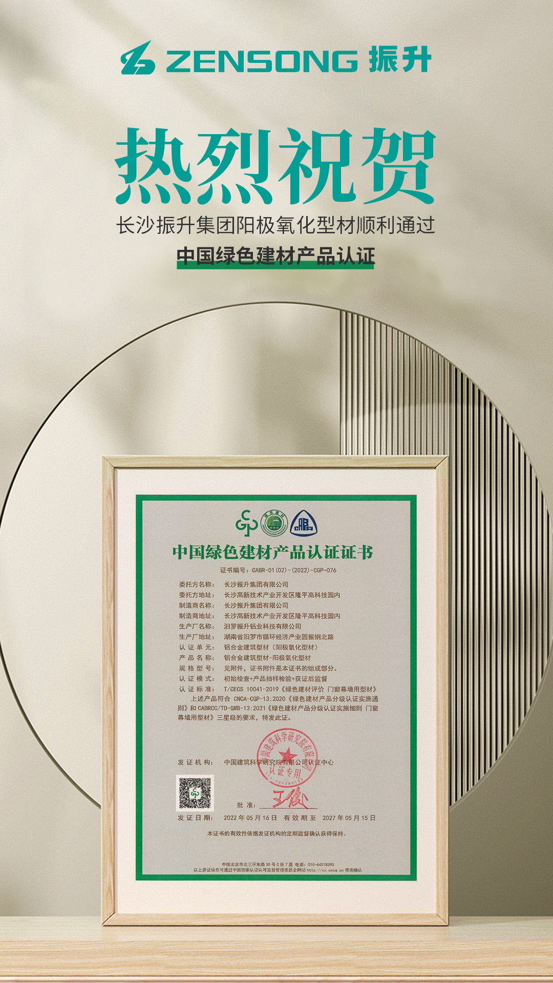 绿色建材产品认证由低到高分为一星级、二星级和三星级,通过中国绿色产品认证的建材产品等同于三星级绿色建材。在为期几个月的努力准备后,经过建筑科学研究院层层严格的资料审查、实地考察等流程,功夫不负有心人,振升阳极氧化型材顺利通过三星级绿色建材的认证。通过认证后的振升铝型材不仅具备作为政府采购的实质性条件,而且能被住建部绿色建材采信应用数据库录入,未来还将被绿色建筑、装配式建筑等工程建设项目优先采用,进一步彰显振升集团产品实力。