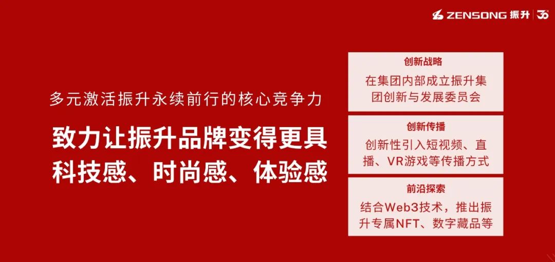 进入数字经济新时代,如何让创新成为振升“升升不息”的核心,激活永续前行的核心竞争力,振升将从多个方面进行持续探索:在集团层面,振升成立了振升集团创新与发展委员会,鼓励全员上下积极发挥能动性,贡献有利于企业发展的创新好点子。在营销上,振升针对90后、Z世代年轻消费群体的购买习惯和喜好,从产品策划到终端营销均作出相应调整,创新性引入短视频、直播、VR游戏等传播方式。未来,振升还将结合Web3技术,推出振升专属NFT、数字藏品,让振升品牌变得更具科技感、时尚感、体验感,让振升持续焕发与时俱进的新鲜活力。三十岁的振升仍如少年般意气风发,在新思维、新模式、新产品、新技术上的尝试会永不止步。