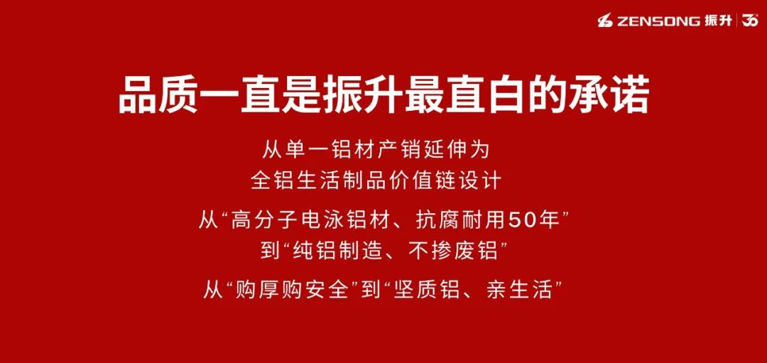 如果说创新是振升发展的生命力,那品质就是振升发展的基石。30年的深厚积累,振升完成了由单一铝材产销延伸为全铝生活制品价值链设计的转型升级,也用实际行动,将“品质”这一承诺,深深刻进了一代代振升人的骨子里:从“高分子电泳铝材、抗腐耐用50年”到“纯铝制造、不掺废铝”,从“购厚购安全”到“坚质铝、亲生活”,振升都在坚持用最直白、最确切的承诺对话消费者、服务消费者。