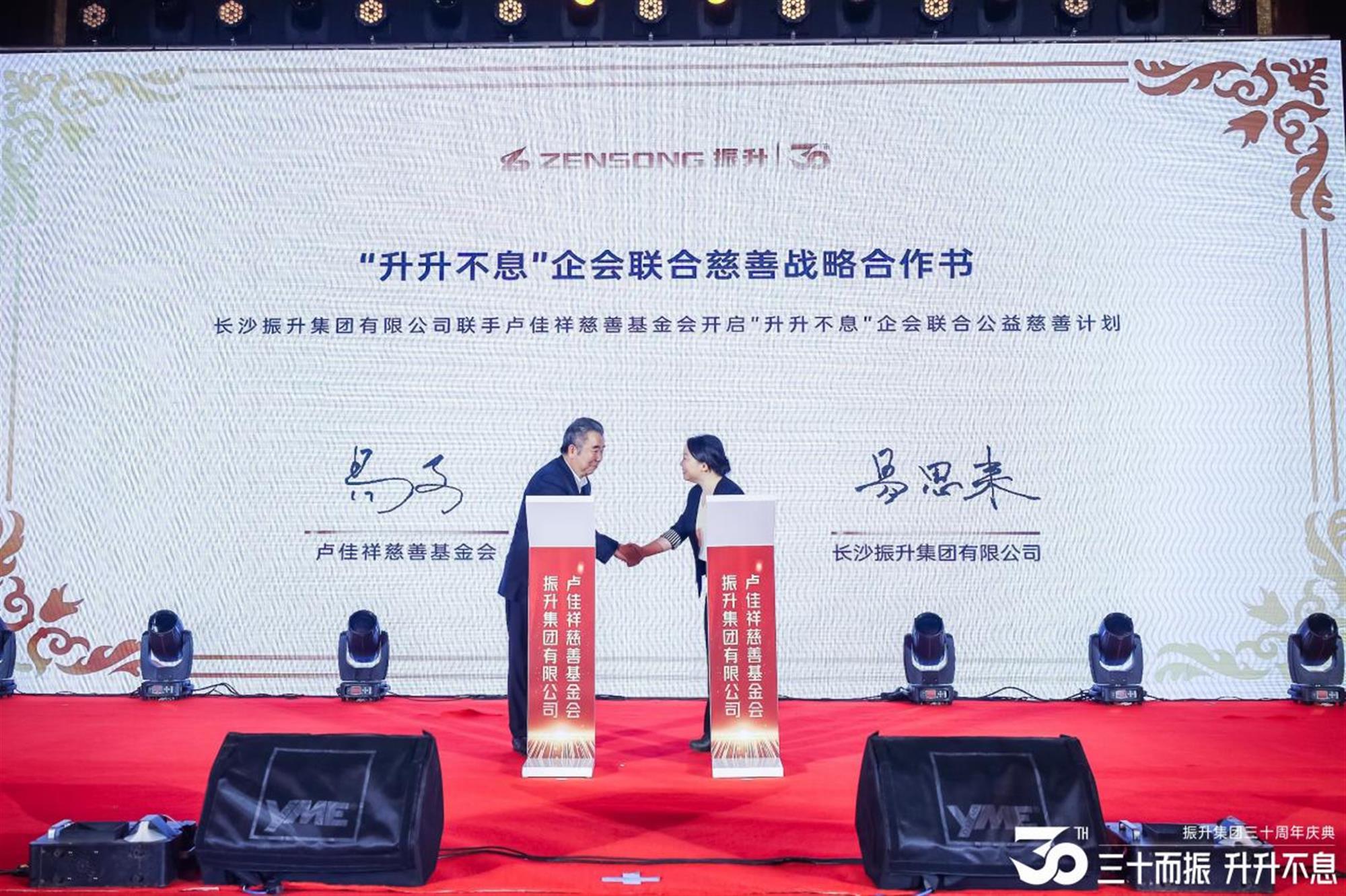 庆典现场,振升集团董事长易思来女士与益阳市卢佳祥慈善基金会理事长易文先生共同签署完成公益合作协议,这也预示着,未来一年,振升将携手益阳市卢佳祥慈善基金会,陆续开展“升升不息暖心工程”系列公益活动。