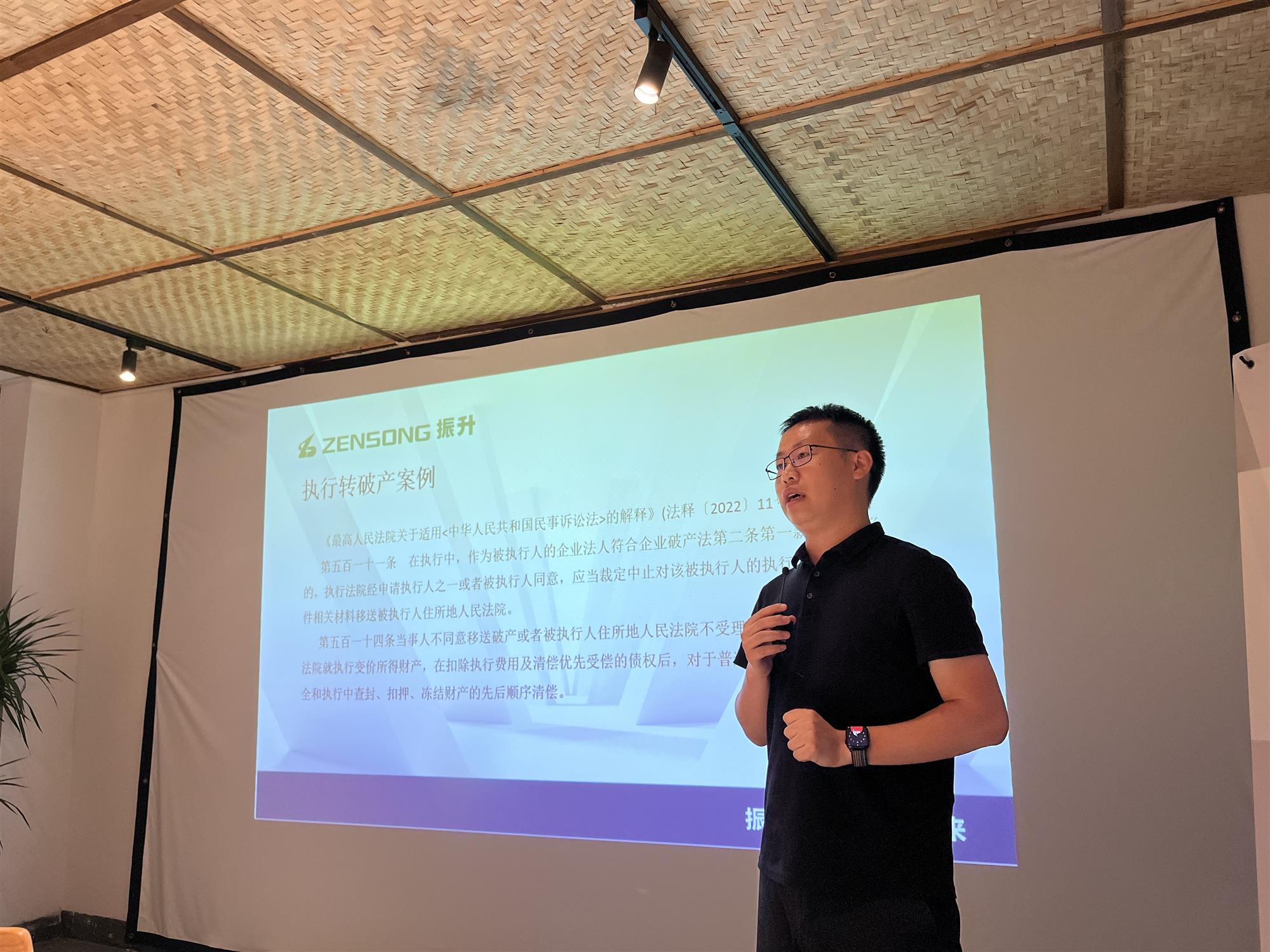 随后,振升集团法务经理刘祥分享了典型工程实务案例。他通过执行转破产案例、破产重整案例等实际案例,生动地展示了在复杂多变的工程环境中,企业如何适应和调整策略。刘经理还强调了对外债权回收的心态和留痕沟通的重要性,为现场嘉宾提供了宝贵的经验和建议。